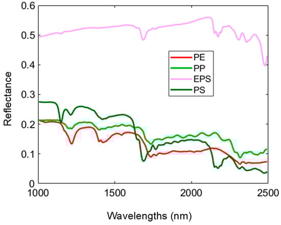 The average raw reflectance spectra of the microplastic particles in the training dataset are plotted in Figure 4. Polymer molecules absorb light due to various vibrational modes and their overtones. This absorption occurs in the SWIR range, making it particularly informative for studying polymers, in the same way as it is for satellite detection of floating plastic [62]. This spectral interval captures the unique vibrational signatures of polymer molecules, providing detailed insights into their composition and structure [63]. The absorption of CH2 and CH3 in the third overtone region (1024, 1157, 1195 and 1220 nm), CH2 in the second overtone region (1403, 1497, 1642 and 1774 nm), and low absorption at 2193 nm because of CH stretch in the first combination region were the characteristics of the PP spectrum. In the meantime, the PE spectrum reveals that CH2 is absorbed in the third overtone region (1050, 1119, 1182 and 1220 nm), CH is absorbed in the second overtone region (1308, 1396, 1422, 1547 and 1714 nm), and CH stretch + CH deformation is absorbed in the first combination area (2018, 2149 nm). The PS spectrum is identified by the absorption of CH2 and CH in the first combination area (1817, 1868, 1918, 2012, 2074, 2149, 2174, 2199, 2312 and 2361 nm), CH2 and δC-H2 in the second overtone region (1352, 1415 and 1648 nm), and CH2 and CH in the third overtone region (1043, 1151, 1214 and 1308 nm). The fingerprints of the EPS and PS are similar; the primary distinctions are in the reflectance values and the lower intensity absorptions of the EPS relative to the PS. The absorption of CH2 and CH in the third overtone area (1151 nm), CH2 and δC-H2 in the second overtone region (1686 nm) and the CH group in the first combination region (1817, 2149, 2174, 2199, 2305 and 2361 nm) are the characteristics of the EPS spectrum.