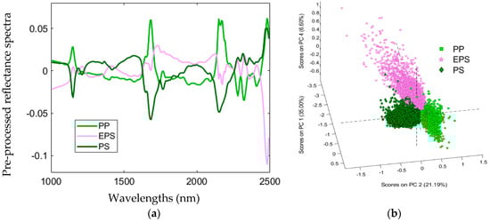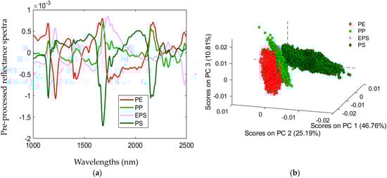 The pre-processed spectra and the PCA score plot acquired for Rule 1 are reported in Figure 5. Normalize, SNV, Detrend and MC algorithms have been sequentially applied to perform spectra pre-processing (Figure 5a). PCA indicated that most of the variance was captured by the first five PCs, as shown in the 3D-PCA (PC1–PC2–PC5) score plot (Figure 5b). More in detail, PC1, PC2 and PC5 explained 46.8%, 25.2% and 3.5% of the variance, respectively. The spectral data of the polymer samples were clustered into two groups according to their spectral signatures, that is PE and EPS/PS/PP. PCA score plot related to Rule 1 showed that PE is isolated from EPS/PS/PP.