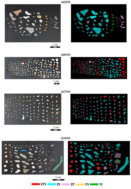 Digital images and corresponding predicted images obtained after the application of hierarchical PLS-DA model of the microplastic samples coming from the Strait of Gibraltar and Mediterranean Sea: (a) A02DS, (b) A06NS, (c) A27NS and (d) A34NS.