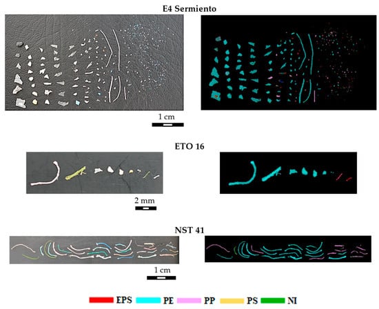 Source digital images and corresponding false color prediction maps obtained from the HSI-hierarchical model of some of the examined microplastic samples from the Western Atlantic Ocean (E4 Sermiento) and the Bay of Biscay (ETO 16 and NST 41) were obtained following the application of the hierarchical PLS-DA model.