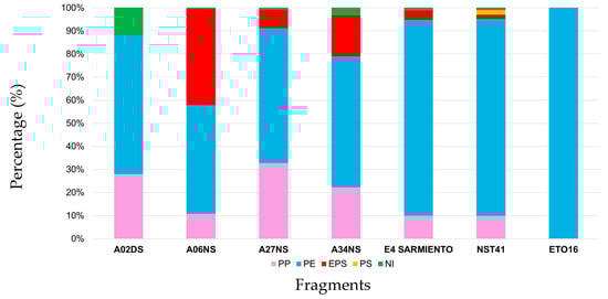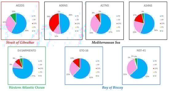 The polymer abundance in each investigated sample is displayed in Figure 9. PE was the most common polymer in the different ocean areas, followed by PP, with only two exceptions: in sample E4 SARMIENTO from Western Atlantic Ocean, PP and EPS were present in equal percentages whereas in sample A06NS from the Mediterranean Sea, EPS was quantitatively the second one. Moreover, PS microplastics were only found in the NST41 sample coming from the Bay of Biscay.