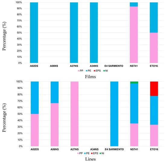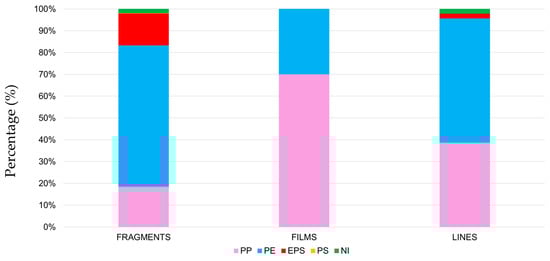 Concerning the correlation between microplastic category and polymer type, it was found that PE was the most common polymer for fragments and lines, followed by PP and smaller amounts of EPS and PS. Films were mainly made up of PP, followed by PE and no other polymers (Figure 11).