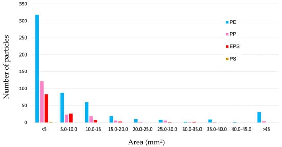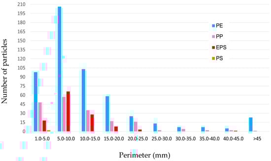 Regarding microplastic fragments areas (Figure 14), more than 50% of the fragments belong to the smallest class (i.e., <5 mm2) and each polymer type peaks in that bin. PE was the only polymer having particles distributed in all classes with more than 7% showing an area bigger than 45 mm2. PP, PE and EPS perimeters peaked in the 5–10 mm class (Figure 15). Also, the perimeter had lower values (i.e., 1–5 mm) for PS particles.