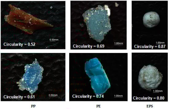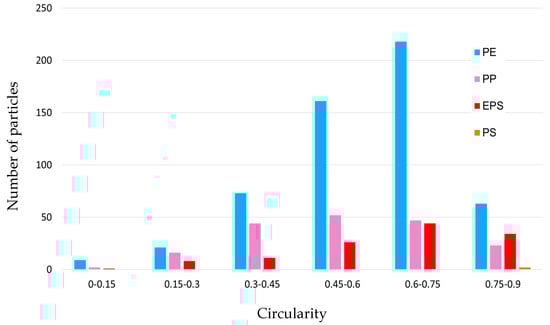 The average circularity (Figure 16) for most fragments (approximately 79.7%) ranged between 0.30 and 0.75. PE and EPS circularity peaked between 0.60 and 0.75, with 40.52% of PE and 32.23% of EPS particles falling in this class, respectively. PP peaked between 0.45 and 0.60 and PS particles have circularity between 0.75 and 0.9 belonging to the more “roundish class” for the circularity parameter. An example of particles with different circularity values is shown in Figure 17: the particle showing lower circularity values (i.e., around or below 0.5) is more elongated than those showing higher values. Microplastics of almost roundish shape show circularity values close to 1.0.