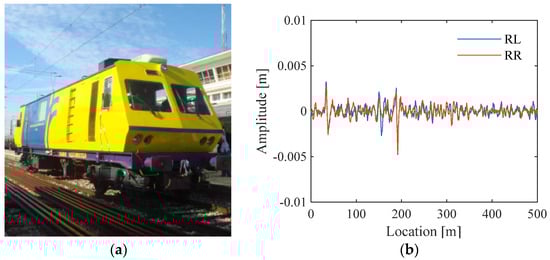For a more efficient operation of the track, maintenance planning, and assessment of traffic safety conditions, railway administrations systematically monitor and assess the geometric quality of railway lines. As an example, Figure 1a shows the EM120 inspection vehicle used by the Portuguese railway administration (IP) for geometric characterization of the line. This vehicle allows, among others, the registration of the irregularity profile along the rail. Figure 1b shows, as an example, the longitudinal level of both rails on a stretch of the Portuguese railway network with the recording of information every 25 cm.