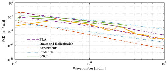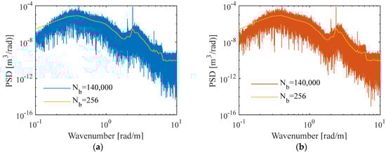 The comparison of the PSD curves shows a smoother profile for the second case, which is attributed to the averaging effect introduced by the shorter block length. However, splitting the initial signal into blocks of reduced length also results in a loss of information at higher wavelengths (lower wavenumbers), leading to an overestimation of amplitude at the initial stages, as is evident in the previous figure. Despite that, for practical purposes, the consideration of minimum wavenumbers of the order of 10−1 rad/m is sufficient for the purposes at hand.