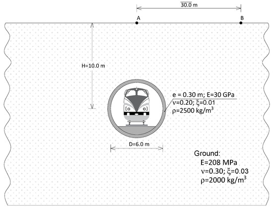 The present section intends to investigate the influence of the use of synthetic rail unevenness profiles on the prediction of ground-borne vibration levels. An overview of the application example is shown in Figure 5, where a tunnel embedded in a homogeneous half-space is presented. The geometrical and mechanical properties are further detailed in the same figure, as well as in Table 3.