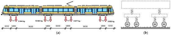 Train model: (a) geometrical configuration and axle loads of the Tram-Train; (b) multi-body train model.