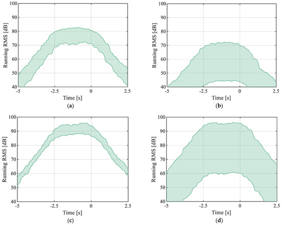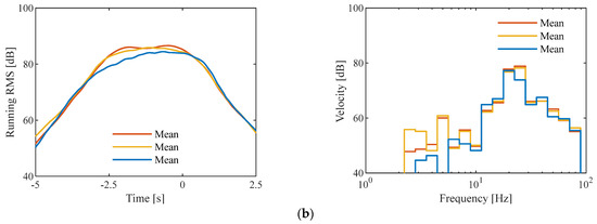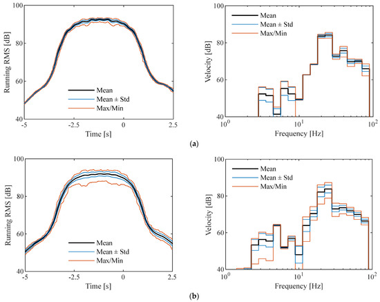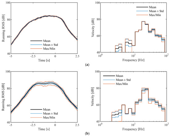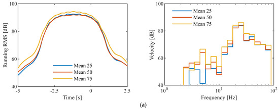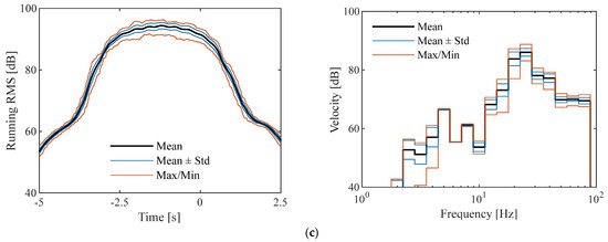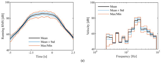 Based on that, Figure 7 and Figure 8 show the mean curves at two different locations on the ground surface (plane of symmetry and 30 m away), in time (running RMS—Root Mean Square—values computed with a time window of 1 s as prescribed by the ISO 2631 standard [21]) and frequency domain (1/3 octave bands), as well as their upper/lower standard deviations and maximum/minimum curves. These curves are repeated for the different number of harmonics considered in the generation of each artificial unevenness profile (25, 50, and 75).