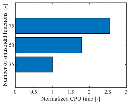 This finding is particularly relevant to the computational efficiency of the numerical tools. In fact, the computation CPU time is directly proportional with the number of harmonics, as can be seen in Figure 10. This figure illustrates the performance of the different cases using a bar chart. The calculation times are normalized in relation to the case of a number of sinusoidal functions equal to 25.
