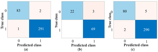 The binary aflatoxin B1 classification accuracy and F1-score are tabulated in Table 1, Table 2 and Table 3 for the selected sets of 4 and 10 spectra using different feature selection methods for datasets 1, 2, and 3, respectively. The confusion matrix illustrating the binary classification accuracy of the support vector machine (SVM) using raw data from dataset 1 is shown in Figure 1. In this analysis, 4 spectra were selected for in-line detection of aflatoxin B1, while 10 spectra were utilized for quality control, where precise measurements are essential. The developed MLPW-SR algorithm selected 4 and 10 spectral bands for both raw and SNV-processed data. For raw data, the selected 4 spectra were 73, 132, 137, and 214, while the 10 spectra set included 44, 68, 97, 100, 115, 137, 158, 171, 181, and 214. For SNV-processed data, the 4 selected spectra were 98, 115, 133, and 167, and the 10 spectra set consisted of 15, 33, 44, 49, 50, 64, 98, 115, 133, and 206.