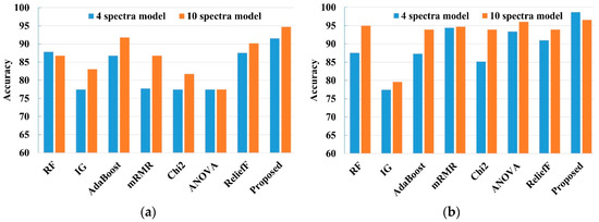 In contrast with other classical feature selection algorithms, the developed algorithm achieved better classification accuracy and F1-score. The tabulated classification parameters in Table 1 have shown that the developed MLPW-SR feature selection algorithm selected the best feature spectra set compared to the RF, IG, AdaBoost, mRMR, Chi2, ANOVA, and ReliefF algorithms, achieving a higher classification and F1-score. The classification accuracy of the selected feature spectra for different feature selection algorithms is also illustrated in Figure 2 for dataset 1.