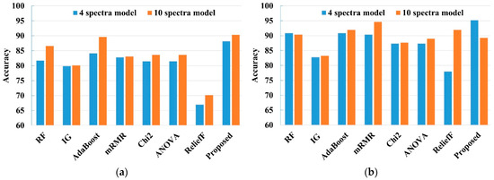 Illustration of binary aflatoxin B1 classification accuracy comparison for dataset 2. (a) Raw data, (b) SNV pre-processed data.