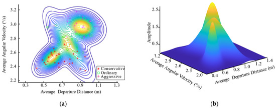 Contour and surface maps of GMM based on K-means clustering results: (a) Clustered contour; (b) Clustered surface. The variations of color shades in this image represent the changes in amplitude under different combinations of angular velocity and departure distance. The gradient from blue to yellow can intuitively display the intensity distribution of different drivers’ driving characteristics. Blue represents lower values, while yellow represents higher values.