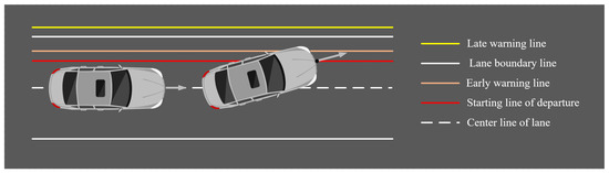 A bidirectional four-lane highway scenario was established on the driving simulator. The speed limit was 60 km/h, and the width of single lane was 3.75 m. The participants needed to drive ego-vehicle on a predetermined route. When the vehicle departed the lane with the turn indicator off and the participant was detected in a distracted state, the LDW system would be activated and warning information displayed on the HMI. According to Chinese National Standard GB T 26773-2011 [20] on lane departure warning systems, the moment when the vehicle outside wheel deviated 1.20 m from the center line of the lane and the turn signal remained off was recorded as the starting time (t1) of lane departure, and the moment when the driver adjusted the steering wheel to return to the original lane as the end time (t2) of lane departure. Time interval between t2 and t1 was recorded as the LDD [21,22]. The departure line at late warning timing was set as the location where the wheel arrived at 0.30 m outside the lane line. The departure line at early warning timing was set as the location where the wheel arrived at 0.35 m inside the lane line, as shown in Figure 4.