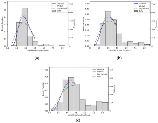 The survival analysis model adopted in this study was explained in Section 2.2. In order to determine whether a parametric, semi-parametric, or non-parametric model needed be used, an early statistical test was carried out. Since the parametric model requires the survival time variable to satisfy any non-negative parametric distribution, this study tested the goodness-of-fit of several distributions, including the Gamma distribution, the Weibull distribution, and the Log-Normal distribution, for the duration variable, LDD. The results are shown in Figure 5. It can be seen that LDD for three warning situations did not fit any of the distributions. Therefore, the non-parametric K-M model and the semi-parametric COX model, which do not require a certain distribution assumption, were suitable.