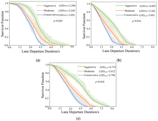 In order to investigate the effect of driving style on the utility of LDW modes, the LDD survival probabilities were computed with the K-M model for three departure warning timings, as shown in Figure 6. The areas around the lines represent the confidence interval. A p-value of less than 0.05 indicates that the LDD has a statistically significant relationship with the driving style. For the no warning condition (p = 0.020), as presented in Figure 6a, the time (LDD) for median survival were 3.001 s, 3.362 s, and 4.002 s, respectively, for the cautious, moderate, and aggressive styles. The LDD increased with the aggressive level of driving styles, and cautious drivers tended to adjust the vehicle back to the original lane in shortest time. For the early warning condition (p = 0.016), as shown in Figure 6b, the time (LDD) for median survival were 1.830 s, 2.245 s, and 3.296 s, respectively, for the cautious, moderate, and aggressive styles. Compared with the no warning condition, early warning shortened the LDD for all driving styles, and the effect was the most significant for cautious drivers and the weakest for aggressive drivers. Thus, early warning was more suitable for the cautious drivers. For the late warning condition (p = 0.010), as depicted in Figure 6c, the time (LDD) for median survival were 2.796 s, 3.012 s, and 4.774 s, respectively, for the three driving styles. Compared with the no warning condition, there was a small increase in the median departure durations of aggressive drivers for late warning timing. Further analysis using a COX model will be required to investigate better the impact of the late warning timing on the driving styles.