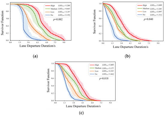 In order to investigate the impact of distraction state on the utility of LDW modes, a study similar to Section 3.2.1 was conducted. Figure 7 shows the survival curves and comparative results from the K-M model. It indicates that the difference in LDD is also significant for different levels of STs (p < 0.05). For the no warning condition (p = 0.002), as shown in Figure 7a, the time (LDD) for median survival were 2.192 s, 3.207 s, 4.665 s, and 5.286 s, respectively, for no-, low-, medium- and high-level STs. The LDD increased significantly with the distraction level of the ST, implying that the distraction state had a significant impact on the LDD. For the early warning condition (p = 0.040), as shown in Figure 7b, the time (LDD) for median survival were 3.099 s, 2.097 s, 2.285 s, and 3.099 s, respectively, for the four levels of STs. It was obvious that the LDD under different levels of distraction tasks were significantly shortened. For the late warning condition (p = 0.018), as depicted in Figure 7c, the time (LDD) for median survival were 1.664 s, 2.235 s, 3.177 s, and 3.809 s, respectively, for the four levels of STs. In comparison with the no warning condition, both the early and late warning could effectively shorten the LDD for all four levels of STs.
