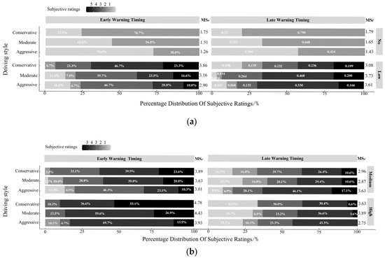 Acceptance ratings distribution of LDW system for three styles of drivers engaged in various levels of STs: (a) no-distraction and low-level STs; (b) low-level and medium-level STs.