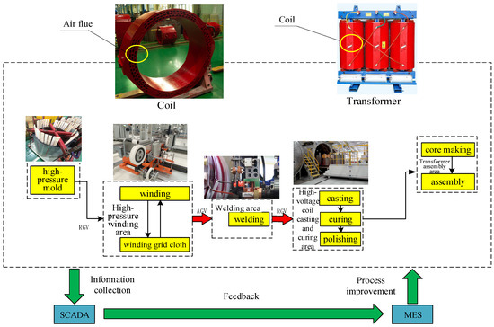 To verify the effectiveness and applicability of the methodology proposed in this study, the research team conducted field validation in the production workshop of a 110 kV dry-type transformer coil at Company A (The company is located in Changji, China). The aim was to assess the capability of this methodology in managing the coil manufacturing process and information traceability. The workshop is equipped with five smart warehouses, two intelligent pouring devices, nineteen smart curing ovens, five AGVs, two RGVs, eight sets of automatic KBK, one raw material testing center, fourteen CNC winding machines, and two sets of beam robots for spool loading. In previous digital transformation efforts, comprehensive digital business systems were established, utilizing remote calling interfaces such as Webservice and Restful for data exchange and integrating platforms, including SCADA, MES, WMS, QMS, AGV control systems, and the Industrial Internet. Each device, workstation, material, personnel, and work-in-progress was assigned a unique identification code. Smart sensors and gateways were employed to automate the collection and association of essential data, including operational data from key equipment, environmental monitoring data, material information, and quality inspection data. Based on this, the implementation and validation of the research method took place primarily from February to June 2024, with detailed content and processes introduced in the following sections.