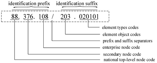 Based on the industrial Internet identification resolution system, unique codes are assigned to the “4M1E” (Man, Machine, Material, Method, Environment) in the coil production workshop, marking, managing, and locating all element resources in the workshop. This facilitates the interconnection, information acquisition, processing, transmission, and exchange of all element resources, thereby providing high-value data resources and operational means for deep, intelligent scenario applications in the coil workshop. To achieve unified coding and identification of all elemental resources in the coil workshop, the Handle coding rule is adopted. The code structure consists of an identification prefix and an identification suffix, separated by the UTF-8 character “/”. The identification prefix is composed of the country’s top-level node code, the secondary node code, and the enterprise node code, separated by the UTF-8 character “.”. The identification suffix consists of element types, element object codes, etc., separated by the UTF-8 character “.”. Element types are divided according to the categories of Man, Machine, Material, Method, Environment, and Measurement. The schematic of the identification coding specification is shown in Figure 2.