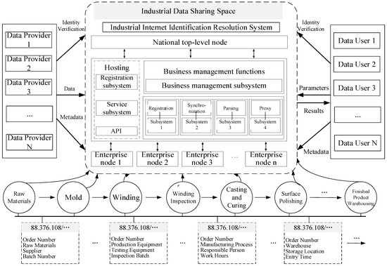 In recent years, the construction and application of the Industrial Internet identification resolution system have opened up new ideas and pathways for information traceability and management. The identification resolution system assigns unique identity tags to each physical or virtual entity, enabling the tagging, management, and localization of resources. It facilitates the interconnection and interoperability of resources, as well as the acquisition, processing, transmission, and exchange of related information, thereby achieving interconnectedness and efficient management of information. Ren [13] studied the IRSII progress and classified existing identity resolution systems into two categories based on the evolution mode: DNS improvement path and DNS-independent innovation path. Wan [14] analyzed the construction scheme of key technology systems such as the network, logo analysis, platform, and security of the industrial internet. He also explored the application mode of the industrial internet in combination with the application practice of traditional industries, such as manufacturing, packaging, and printing. Song [15] combined the OPC-UA system architecture with the identification parsing service to better integrate the latter with the equipment and perform efficient collection of key data in all the production aspects. Zou [16] conducted unified hierarchical registration and real-time analysis of different enterprises, orders, equipment, materials, production processes, and products through the identification analysis system. Wu [17] developed the industrial Internet identification and resolution node system for the instrument and meter industry. This allowed the achievement of unified coding and connected the national top nodes and enterprise nodes, which ensures data coherence across the entire value chain of the instrumentation and metering industry. Fei [18] pioneered the new chemical materials industry, achieving cross-regional, cross-industry, and cross-enterprise data sharing through the use of industrial internet identification and resolution technology. He demonstrated innovative applications such as product life cycle tracking, product quality traceability, and industrial chain collaboration. Diao [19] designed the platform architecture, application architecture, and functional architecture of the secondary nodes of the petrochemical industry. He also studied the innovation scenario of the identification and resolution system according to the characteristics of the petrochemical industry, including production, equipment, and energy management. This design lays the foundation for the construction of an industrial internet + smart factory in the petrochemical industry. Li [20] studied the construction approach of industry secondary nodes based on the Handle system. He also proposed a Handle identification analysis system and a technical realization method that can be applied to the electric power equipment manufacturing industry.