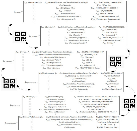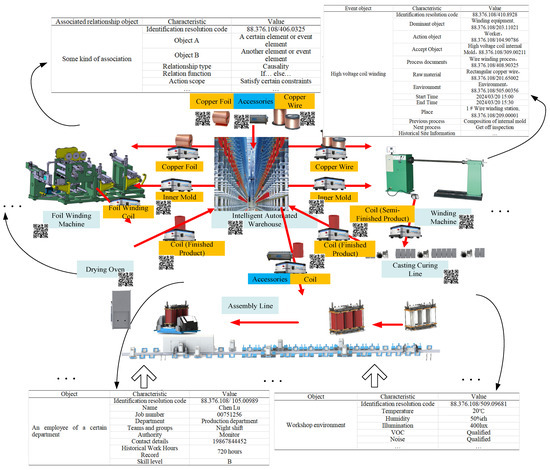 In the transformer coil production workshop, there is a large quantity of all-factor resources, including personnel, machinery, materials, methods, and environment, resulting in a vast number of traceability information elemental models. This can lead to confusion and ambiguity in the relationships and identities of data and resources. To address this issue, the Industrial Internet Identification and Resolution code can serve as a bridge connecting production resources and traceability information. Each instance of machinery, materials, processes, semi-finished products, and information elements involved in the coil manufacturing process is assigned a unique code identifier. Through the integration of identification resolution methods with the extensible element theory, a core-based identification element information model for the “4M1E” elements of coil production is constructed. This facilitates the establishment of a traceability information association network with clear hierarchies and defined structures. Each elemental unit corresponds to production traceability information in the database table. Drawing from the object modeling principles in software engineering, meta-model elements are defined to imbue objects with internal structure and variability. Through this approach, real-world entities, events, and relationships are systematically mapped and associated with virtual models within the information system. This process is illustrated in Figure 4.
