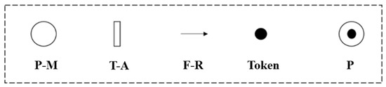 The identification-resolving expandable Petri net for traceability of coil production processes simulates and analyzes system behavior through the interaction of four basic elements: places P, transitions T, directed arcs F, and token. P represents the system’s states, depicted by circles; transitions represent events in the system, depicted by short rectangles; directed arcs define the causal relationships between states and events, depicted by arrows; while tokens indicate whether states satisfy the transition conditions. The specific symbols are illustrated in Figure 5.