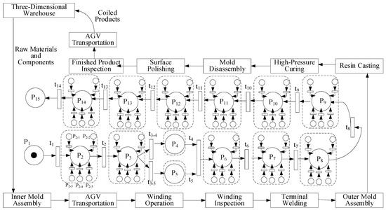 The complete manufacturing process of a transformer coil starts with the online placement of production orders and enters the production state by scanning the identification resolution code of the orders. Following the production process path and workflow of the coil, it goes through operations such as inner module assembly, coil winding, resin casting, high-voltage curing, etc., at respective workstations to perform related process operations. Additionally, activities such as quality inspection of materials and semi-finished products, transportation circulation, and equipment parameter collection are involved. Throughout the manufacturing process, real-time collection of comprehensive production information and status regarding personnel, machinery, materials, methods, environment, and measurements related to coil production is conducted. This is achieved through identification resolution coding for the entire process identification, and correlation and pathways for process evolution and information flow are established based on Petri nets. Finally, the finished coils that have passed inspection are stored in a three-dimensional warehouse. This study establishes a comprehensive information collection and integration model for coil production processes using identification resolution and expandable Petri nets, as shown in Figure 6.