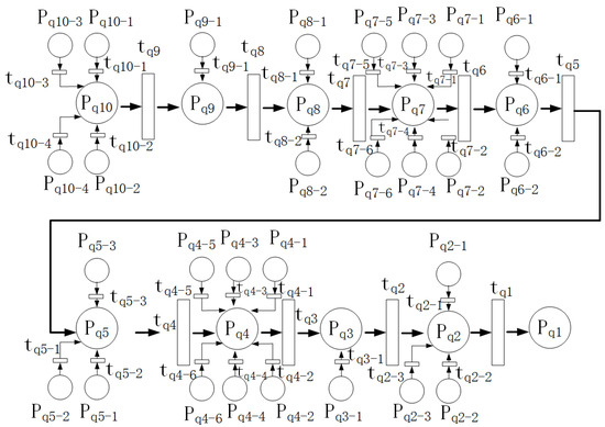Taking the traceability of quality information in the coil manufacturing process as an example, coils flow continuously along the process path, with states and information constantly changing and migrating. The paths of information association are extremely complex, making it exceptionally difficult to trace quality issues; the main characteristic elements of quality traceability information are shown in Table 9 and Table 10. To address this challenge, integrate the above mathematical model with Petri nets; a traceability path is constructed based on the physical element model corresponding to each place P and the event element model corresponding to each transition t in the transformer coil manufacturing process. Taking the influencing factors of coil manufacturing quality as nodes, a traceability and control path for quality anomalies has been established. As shown in the Figure 10, Pq1–Pq10 represent ten key control stations for the quality of coils (traceability scenario); during the coil production process, the tasks mainly include mold inspection, raw material inspection such as insulation paper, full-process inspection of the winding process, casting and curing inspection, coil polishing, finished product appearance inspection. Each Pqi-j associated with Pqi represents all the traceability units included in that traceability scenario. For example, from Pq10-i to Pq10, it includes traceability units such as mold outer diameter measurement, circumference measurement, perpendicularity measurement, and overall appearance cleanliness inspection in the “Mold Quality Inspection” scenario. The directed arc between Pqi-j and Pqi represents a merging traceability scenario; if the direction of the arrow is reversed, it indicates a disassembly traceability scenario. The rectangle t represents the transformation for acquiring traceability scenarios and traceability units. The directed arc from Pqi to Pqj represents the linear transfer of traceability information based on the traceability scenario. Pq10 to Pq9 indicates that after the mold parameters have passed inspection and been fully recorded, transition t9 is triggered, changing the inspection task from the mold inspection state to the insulation cylinder appearance inspection. By analogy, each Pqi is an equality report state built upon the integration and accumulation of Pqi-j on the basis of Pqi-1. Pq1 represents the final complete quality report after coil production, containing all quality information from Pq1 to Pq9. The formation of the quality report involves the integration and accumulation of quality information from each stage. The transmission and traceability path of quality information in the coil manufacturing process has been constructed based on the above rules. At any point (any Pqi and Pqi-j), by scanning the identification codes carried by the in-process coils (such as QR codes, barcodes, or RFID tags), one can quickly obtain forward traceability information (records of historical information that has occurred) and backward traceability information (upcoming stations and relevant information) based on the Petri network structure. This enables precise quality traceability and efficient management of processes.