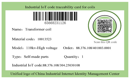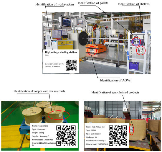 Based on the Industrial Internet Identification Resolution Service System, unique identification resolution codes are applied and registered for electromagnetic coil raw materials, AGV carts, molds, winding equipment, casting equipment, drying equipment, work-in-process coils, finished coils, production lines, and other elements involved in the coil production process. All comprehensive information regarding orders, processes, and quality related to coil product manufacturing is associated with identification resolution codes. As shown in Figure 12 and Figure 13, the workshop has set up coding stations to achieve one-to-one mapping and binding correlation between physical entities and identification codes, barcodes, QR codes, IC cards, RFID chips, and other carriers employed as coding mediums. RFID readers/writers, industrial cameras, laser scanning devices, etc., are deployed in three-dimensional warehouses, workstations, and other locations for real-time identification of the identity information of materials, work-in-process items, personnel, etc. This information is then associated with collected data such as order information, work hours, equipment parameters, quality information, etc. The data are synchronized to the server through Ethernet-connected data acquisition systems. The commonly used coding carrier technologies and their performance in the coil workshop are summarized in Table 11.