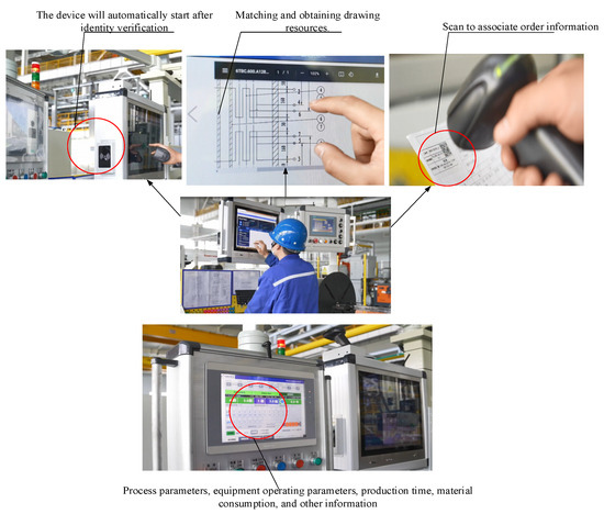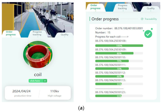A lightweight software application (The version of the software used in this study is version 1.2.1) for information traceability in the coil manufacturing process was developed based on the industrial Internet identification and resolution system, combined with the extended Petri net analysis proposed in this study. As shown in Figure 15, Figure 16 and Figure 17, information traceability cards with identification codes are attached to coils, equipment, personnel, and materials, facilitating the collection and correlation of all process information based on these identification codes. For example, in the coil production process, operators must complete a permission verification based on identification codes before starting the equipment. Once the equipment is successfully started, it automatically associates the device code with the operator’s code. Additionally, operators do not need to interact with the system; they can simply scan the device code and order code to automatically retrieve drawings and work instructions. Once prepared, by scanning the identification code of the work-in-progress, they can automatically obtain and distribute process parameters, initiating the winding operation. Each of these scanning actions triggers automatic data collection and recording, laying the foundation for information traceability. At any stage of coil production, by identifying the unique code, information flow paths and detailed information within the Petri net can be obtained based on this code. For example, historical information can include the source of raw materials, process parameters, production personnel, production equipment, and quality inspection data. Moreover, based on the “modeling theory for the acquisition transformation of traceability scenarios and traceability units” proposed in this paper, predicting the position and process status of the coil at future moments is considered an acquisition transformation of subsequent traceability units. Utilizing the coil’s current position, standard working time, accumulated quality errors, and process path, the production progress can be determined in real time, enabling the prediction of potential production waiting for waste and bottleneck risks. In logistics, warehousing, distribution, and other processes, the movement of key materials undergoes multiple traceable stages, which can be conceptualized as a linear traceability scenario. By leveraging identification resolution codes, the movement time, location, usage records, and operators of materials can be sequentially associated and recorded. Furthermore, upon completion of coil production, the identification resolution code serves as input to associate and retrieve multiple traceability units through a disassembled traceability scene transformation. This process allows for the retrieval of detailed information, including product batches, production entities (factories, workshops, production lines), raw material suppliers, process station records, and comprehensive quality reports. Furthermore, by integrating and analyzing the collected product traceability information, a data platform and management system are constructed to establish a database and traceability records for coil production information within the system. Utilizing data analysis methods, process data are mined and analyzed to identify potential issues and trends, providing a basis and support for quality management and safety control.