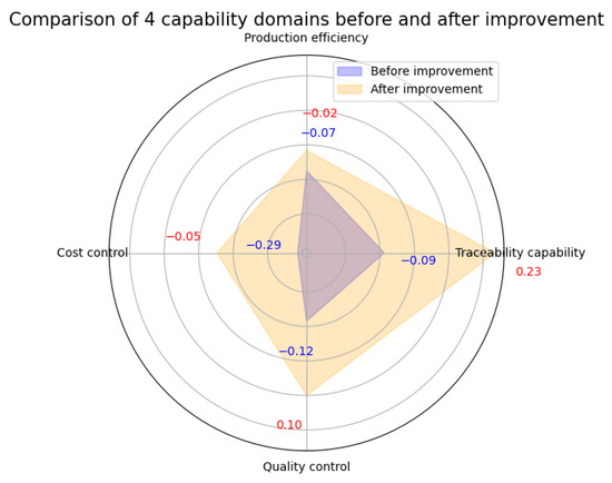 To comprehensively evaluate the improvement effects before and after implementation, an analysis was conducted on the enhancement of four capability domains: information traceability, production efficiency, cost control, and quality control. Multiple key indicators were selected under each capability domain to measure the operational status of the workshop. Additionally, a nine-point scale method was employed to scientifically assess the importance of each indicator, with a particular focus on performance in areas such as information traceability, quality control, and the reduction of non-value-added time. To determine the weight coefficients of the evaluation indicators, the Full Consistency Method (FUCOM) was utilized to ascertain the specific weight for each indicator. The advantage of this method lies in minimizing the deviation between the weight coefficients and the estimated comparative priorities, ensuring the accuracy and consistency of the weight coefficients. The indicator parameters and weight coefficients used for evaluation are shown in Table 12; the main evaluation indicators under the traceability capability domain include traceability coverage (denoted as I1), traceability accuracy (denoted as I2), and traceability response speed (denoted as I3). The main evaluation indicators under the production efficiency capability domain include cycle time (denoted as I4) and equipment maintenance response time (denoted as I5). The main evaluation indicators under the cost control capability domain include material outbound operation time (denoted as I6), finished products inbound time (denoted as I7), raw material waste (denoted as I8), and work-in-progress transfer time (denoted as I9). The main evaluation indicators under the quality control capability domain include pass rate (denoted as I10) and error-proofing status of materials (denoted as I11).
