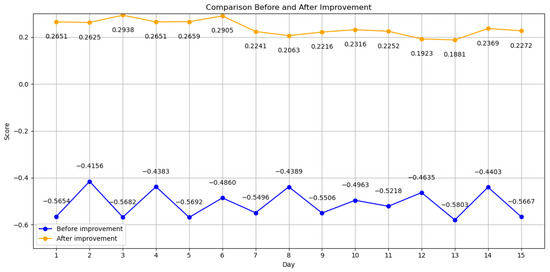 Based on the calculation principles outlined in Formulas (21)–(23), the average scores for the capability domains and the total daily scores were obtained for the 15 days before and after project implementation. As shown in Figure 18, the average levels of the four capability domains have improved post-implementation, particularly in traceability and quality control, which saw significant enhancements. Figure 19 illustrates that the workshop operation scores after the project implementation are notably higher than those before, and the fluctuations in the curve indicate a smoother operation process, which is more conducive to stable workshop performance. The results indicate that the project implementation significantly improved various capability indicators, demonstrating its effectiveness. This not only enhanced workflow and increased operational stability but also helped reduce production risks, laying a foundation for future continuous improvement. It holds considerable value and significance for workshop production management and information traceability.