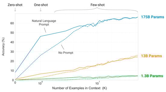 With the development of large language models, it has been noted that they show the ability to solve tasks for which they were not taught initially based on queries (known as zero-shot prompting) and pointing to examples (known as few-shot prompting) without fine-tuning [13]. The fine-tuning process is understood here as updating parameter values during the model learning process. Figure 1 shows in a graph the increase in the quality of language models in zero-, one-, and few-shot prompting tasks with the rise in the number of parameters of these models and the number of examples.