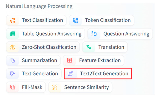 Classification of language models by classes of NLP problems with the highlighted class Text2Text Generation (source: https://huggingface.co/models, accessed on 15 August 2024).