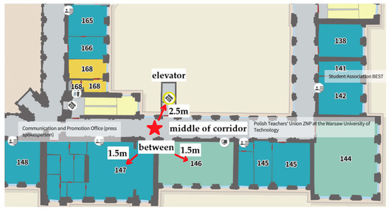 A section of the building map showing the location (red pentagram) selected for description. Illustrated is the spatial analysis performed, based on which phrases were extracted to feed the language model (own elaboration).