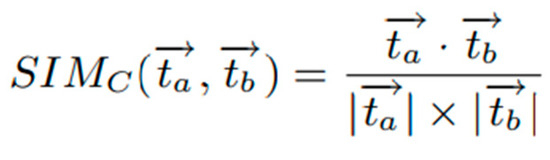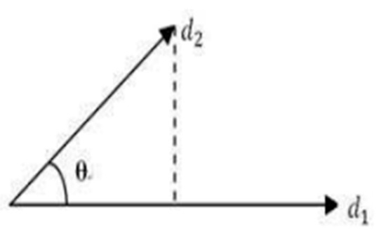 In the formula above, and are m-dimensional vectors in the set of terms T = {t1, ..., tm}. Each dimension represents a term in the document with a non-negative weight assigned to it [31]. The cosine distance of two documents d1 and d2 is the normalized scalar product of the vectors d1 and d2 (Figure 5). It represents the cosine of the angle between the two vectors representing the documents. Documents d1 and d2 are identical if the value of the cosine measure is 1. Documents d1 and d2 are not similar if the value of the cosine measure is 0: