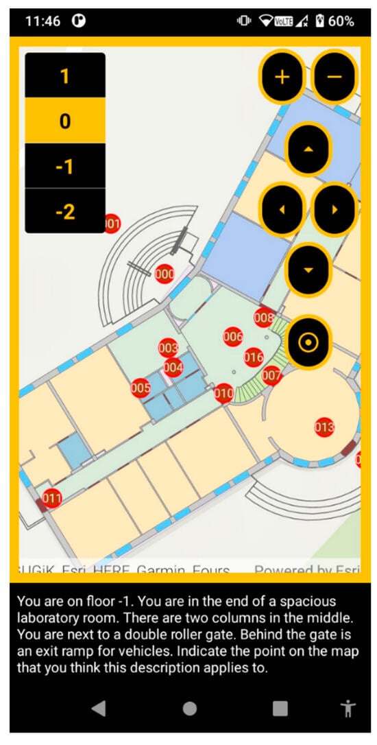 A GeoDescTest mobile application was created specifically for this study. It can be run on devices with the Android operating system. It was made in the Android Studio environment in the Kotlin language. The map was generated using ArcGIS SDK technology. The building model was developed at the university (anonymized) as part of the “PW Building Accessibility Maps Project” [1]. Figure 6 shows the main screen of the application.