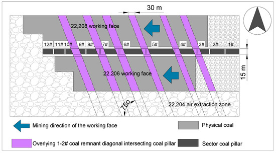 The Huojitu Mine in Daliuta is a typical example of close-distance coal seam mining, located on the Shaanxi side of the border between Shaanxi Province and the Inner Mongolia Autonomous Region, under the jurisdiction of Zhongji Township, Shenmu County. The eastern side of the 22,206 and 22,208 working faces is adjacent to the 2-2# coal seam’s south wing auxiliary transport main roadway in the second panel area, while the western side is adjacent to the 2-2# coal seam’s upper 301 return air measure roadway. The northern side borders solid coal seams, and the southern side is adjacent to the 22,204 working face. Influenced by the mining of the overlying 1-2# coal seam, numerous obliquely intersecting coal pillars, approximately 30 m wide, remain in the goaf. These oblique coal pillars overlap with the transportation roadway of the 22,206 working face and the return air roadway of the 22,208 working face in the underlying 2-2# coal seam, along with the section coal pillars laid out between them.