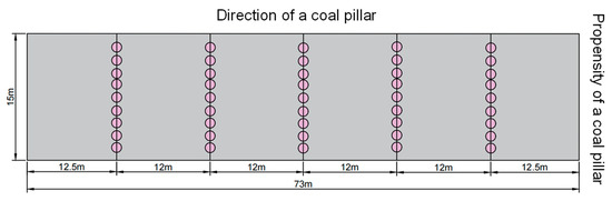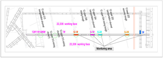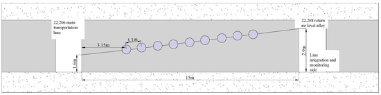Five FBG arrays were installed along the strike direction of the section coal pillars. One array was placed in the center, with two arrays on each side in an axially symmetrical manner to monitor the shoulder areas of the bell-shaped load, aiming to capture deformation data from different positions along the inclination direction of the coal pillars. Based on the calculation of the influence range of the overlying oblique coal pillars from the 22,208 working face, which is 72.26 m, the 5-1# section coal pillar is located directly below these oblique pillars and within their influence range, exhibiting a bell-shaped load distribution. Enhanced monitoring was conducted at the central position of the 5-1# section coal pillar, with the process layout along its strike direction illustrated in