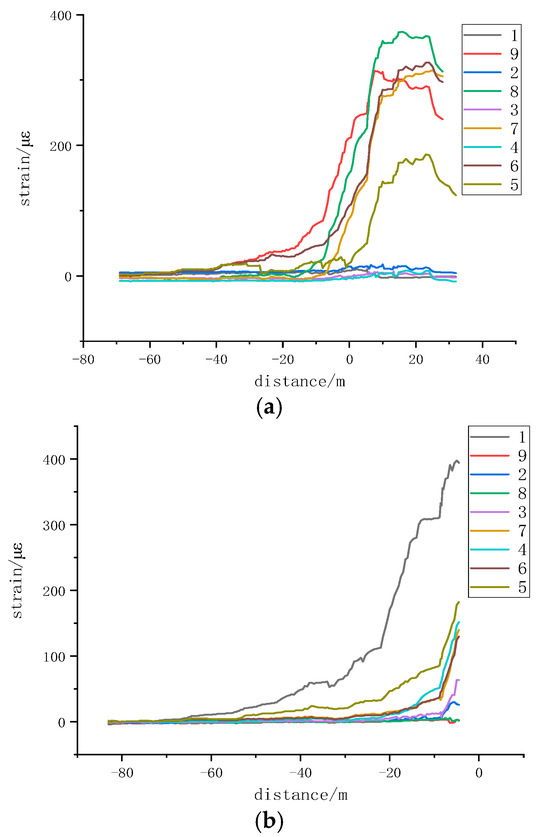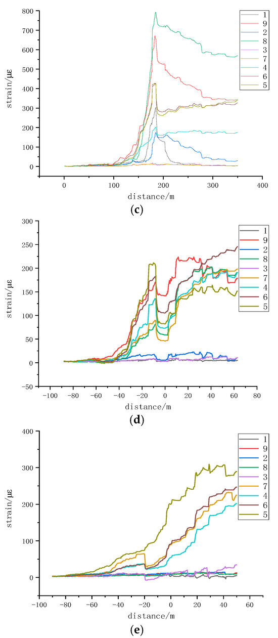 Figure 6 shows the deformation monitoring results of the 5-1# section coal pillar from 9 July to 29 July, based on monitoring points 1–9 from five FBG boreholes. The strain variation curve at monitoring points 1–9 in borehole 1 shows that with the advancement of the working face, the strain near the 22,208 working face rapidly increased due to the impact of mining stress on the underlying coal seam working face. The stress concentration effect gradually increased within about 10 m in front of the working face. Subsequently, the strain curve quickly decreased, indicating that the 5-1# section coal pillar was affected by the concentrated stress of the overlying oblique residual coal pillars. The deformation influence range was from the monitoring points 5 to 9 on the left side at 12.5 m, while there was almost no noticeable change in the range from monitoring points 1 to 4, differing from the strain variation patterns under vertical or parallel conditions of the overlying and underlying coal pillars.