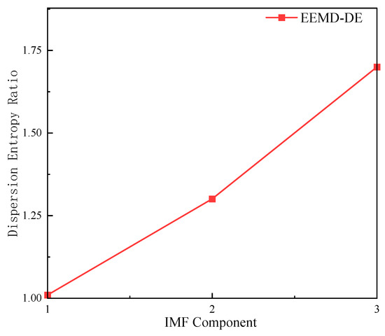 The larger the dispersion entropy value, the higher the complexity of the time series; conversely, a smaller value indicates lower complexity. If the dispersion entropy value of the IMF components of the strain data is large, it proves that the complexity of the IMF components is higher and contains more noise signals. Conversely, it proves that the IMF component contains useful information from the original time series. Therefore, when the dispersion entropy values of adjacent IMFs change abruptly, it indicates a sharp increase or decrease in the noise content between the two IMF components. In this paper, the threshold point is denoted as M. The dispersion entropy values and the ratio of the dispersion entropy values of adjacent IMFs are calculated for each IMF component obtained from the EEMD decomposition.