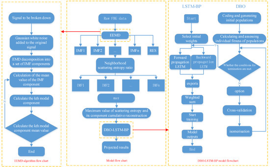 33] combined with EEMD to construct a denoising algorithm model. The DE algorithm is used to filter the effective IMF components from the EEMD decomposed IMF components, eliminating the components with a high noise ratio, and reconstructing a signal with high fidelity. Subsequently, singular value decomposition (SVD) is employed for secondary noise reduction, laying the groundwork for subsequent optical fiber grating sensing prediction studies of section coal pillar deformation. This study aims to optimize the long short-term memory neural network with the dung beetle optimization (DBO) algorithm to construct a deformation prediction model for section coal pillars. It aims to achieve the real-time monitoring and prediction of section coal pillar deformation under shallow-buried close-distance residual oblique coal pillars, improving the safety factor of underground face mining, and providing guidance for roadway support and decision-making.