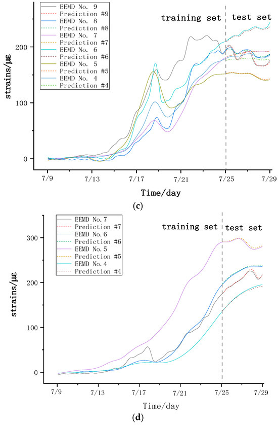 Figure 13 shows the comparison between predicted and actual monitoring values at different advancement distances of the working face. When the working face advanced to approximately 1360.5 m, a small peak in strain at monitoring point 9, close to the 22,208 working face mining side, was observed. At this point, the MAE, MSE, RMSE, and R