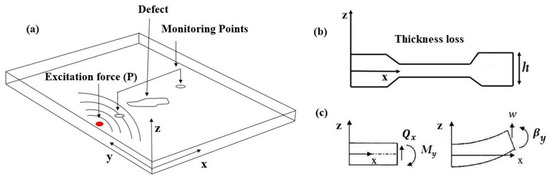 Consider a thin homogeneous, isotropic and linearly elastic plate having thickness h subjected to an excitation force P, as shown in Figure 1a. The general configuration of the defect in the plate is shown in Figure 1b. It should be noted that the actual one-sided thickness defect is approximated by the symmetric two-sided thickness reduction. The internal forces and deformations in the plate are shown in Figure 1c.