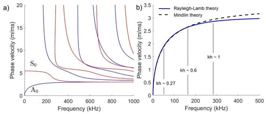 (a) Dispersion curves of Lamb modes for a 10 mm steel plate (red line: symmetric modes, blue line: anti-symmetric modes); (b) Phase velocity of mode.