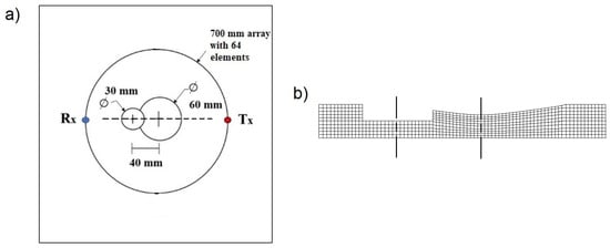 The appropriate forward model of GWT needs to be of low computational cost and complexity of combining it with the inversion procedure of the tomography algorithm. Consequently, many tomography applications make use of the simple acoustic model for plates [16,17], pipes [18,19], and pipe bends [20,21] as they are able to map the thickness of the waveguide from the velocity of the propagating wave. However, the accuracy of the acoustic model decreases if the size of the defect is around a few wavelengths of the probing wave, due to inability to describe the scattering [22,23] including reflections, which are important to achieve higher resolution imaging [24].