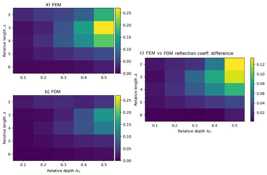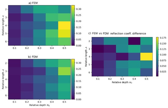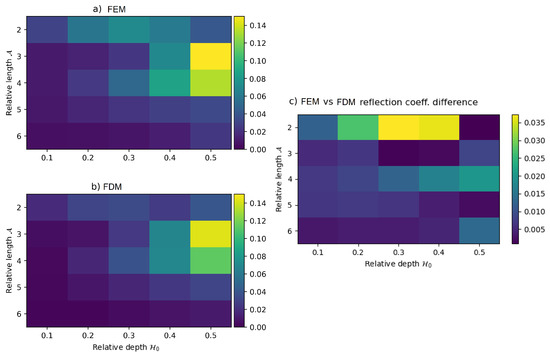 The first case study examines the accuracy of the Mindlin plate theory for defects that closely align with the theoretical assumptions, specifically, those with a defect profile symmetric to the plate’s midplane (Figure 1b). Figure 5 compares the reflection coefficients between the Mindlin model (FDM) and the FEM model (FEM) for various defect lengths and depths for the mode at 50 kHz. The reflection amplitude for these defects is generally low, peaking at approximately 0.14 for the deeper defects. The agreement between the two models is strongest for shallower, longer defects, while the relative difference increases as the defects become shorter and deeper, with a maximum difference of about 3.5%.