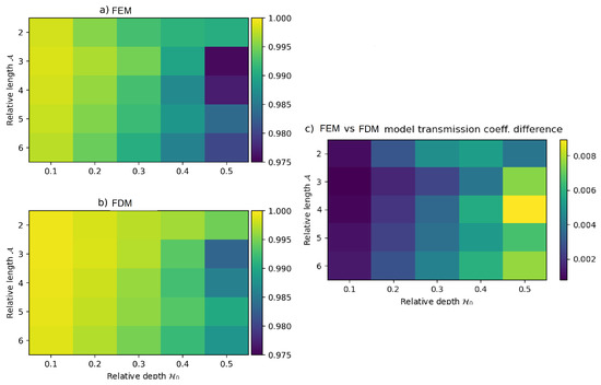 Figure 6 shows that for smooth defects, most of the energy is transmitted, with the transmission coefficient close to 1. The consistency between the models in Figure 5c mirrors that in Figure 6c, indicating that transmission accuracy decreases for short, deep defects. However, the relative difference between the models remains minimal, at less than 1%.
